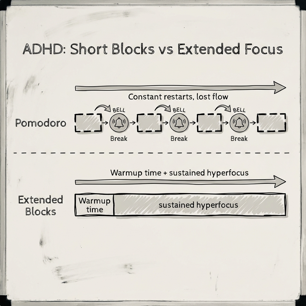 - Longer sessions respect the startup cost. If you spend 15 minutes getting focused, a 60-minute session gives you 45 minutes of hyperfocus. That's 75% efficiency versus 40% with Pomodoro.