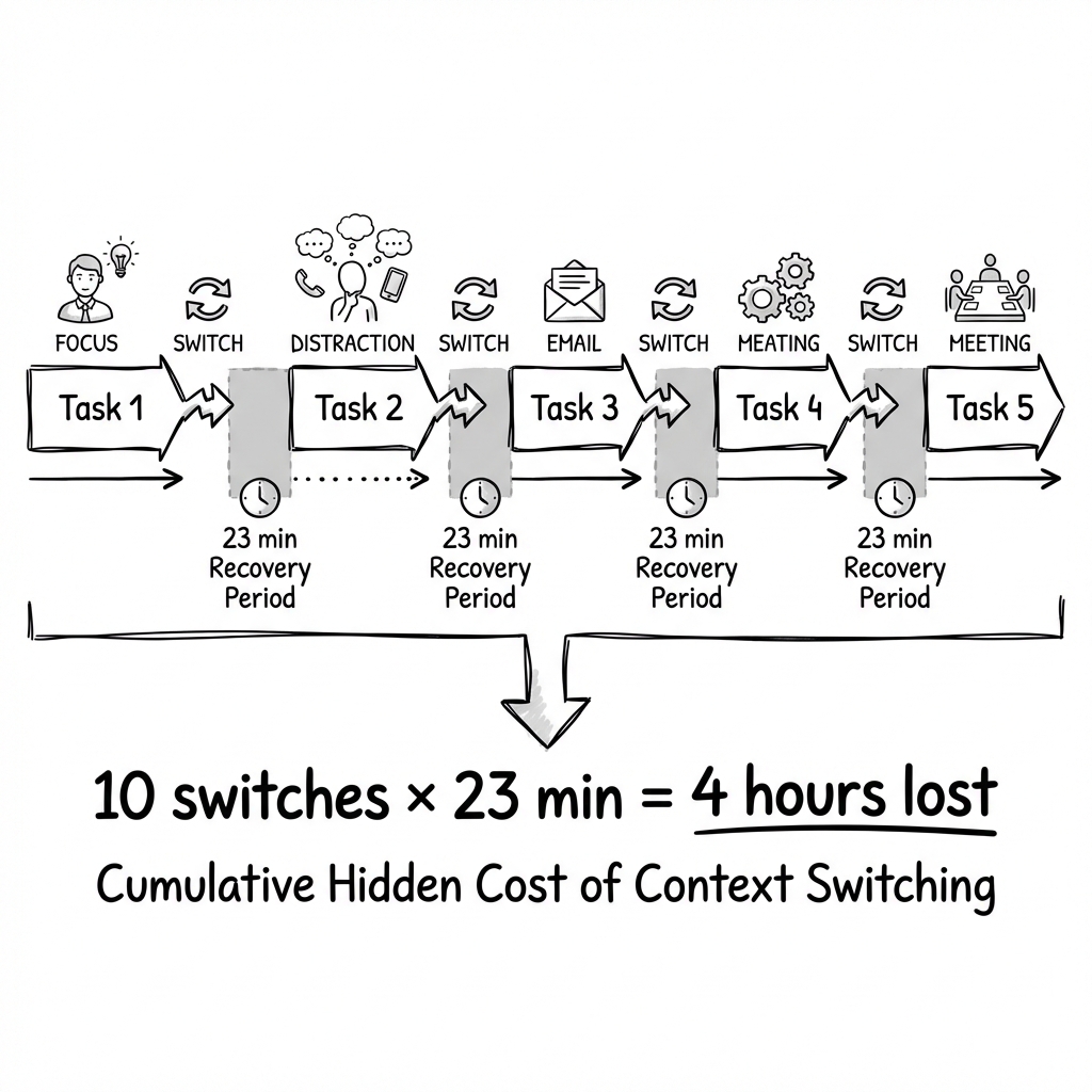 If you switch tasks 10 times per day—which is conservative for most knowledge workers—you're losing 12.5 hours of focused work every week. That's more than a full day gone to transition costs alone.