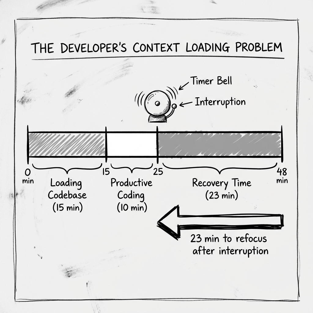 Depending on the complexity, this loading process takes 10 to 25 minutes. Studies on programmer productivity confirm this—context establishment is a significant portion of development time.