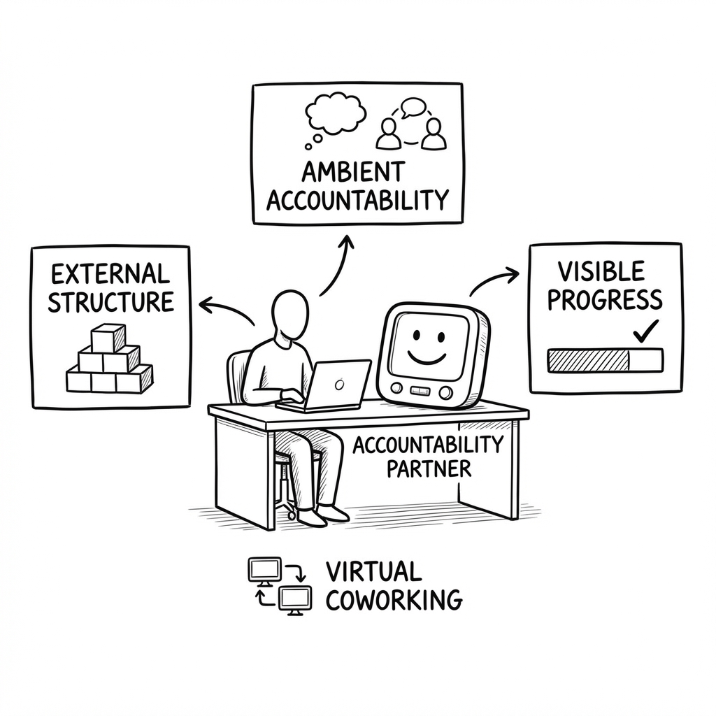 The simplest version: get on a low-stakes video call with a friend, state what you're working on, and work in parallel. Occasional check-ins optional.